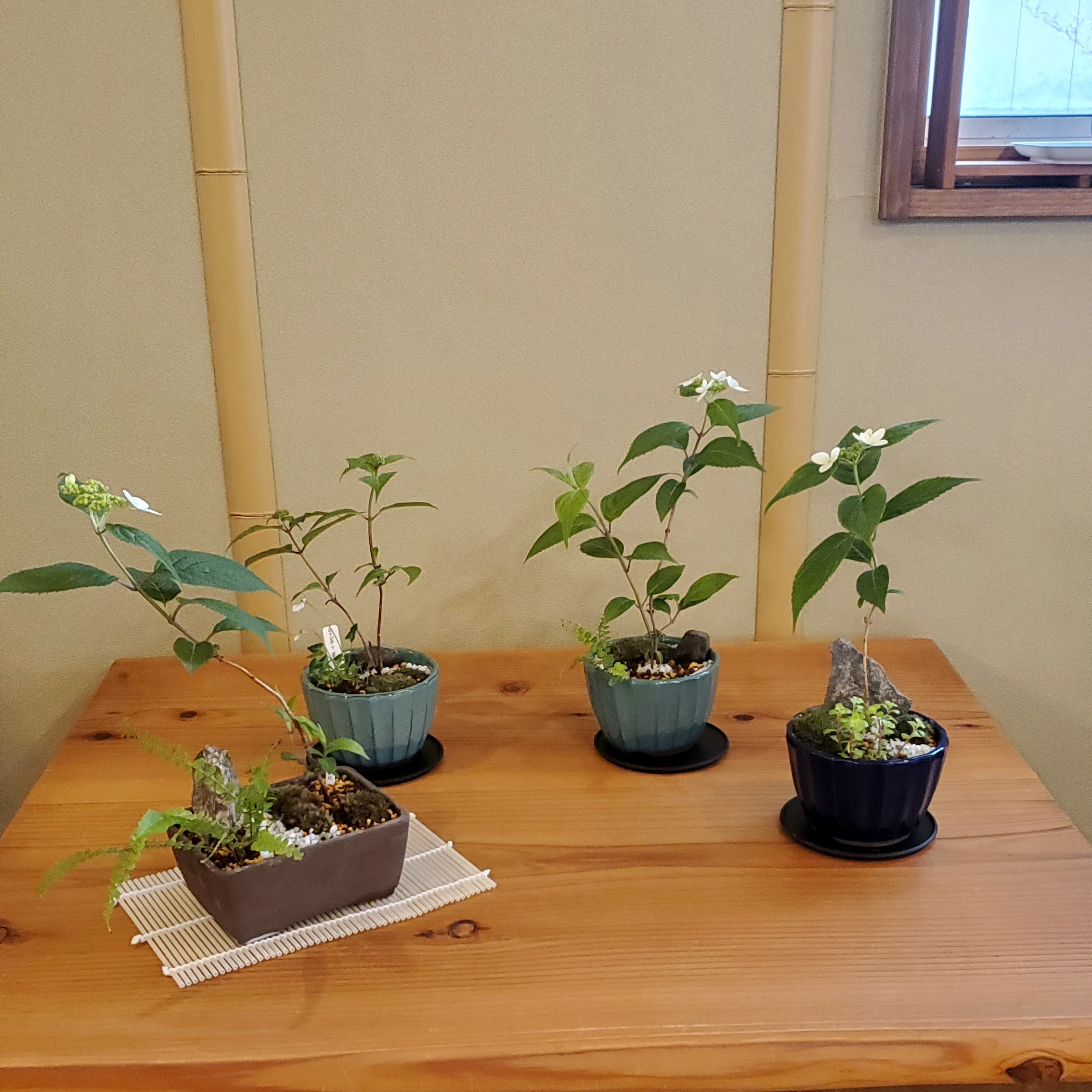 当店で育てているヤマアジサイを使ってミニ盆栽に仕立てるワークショップです。
